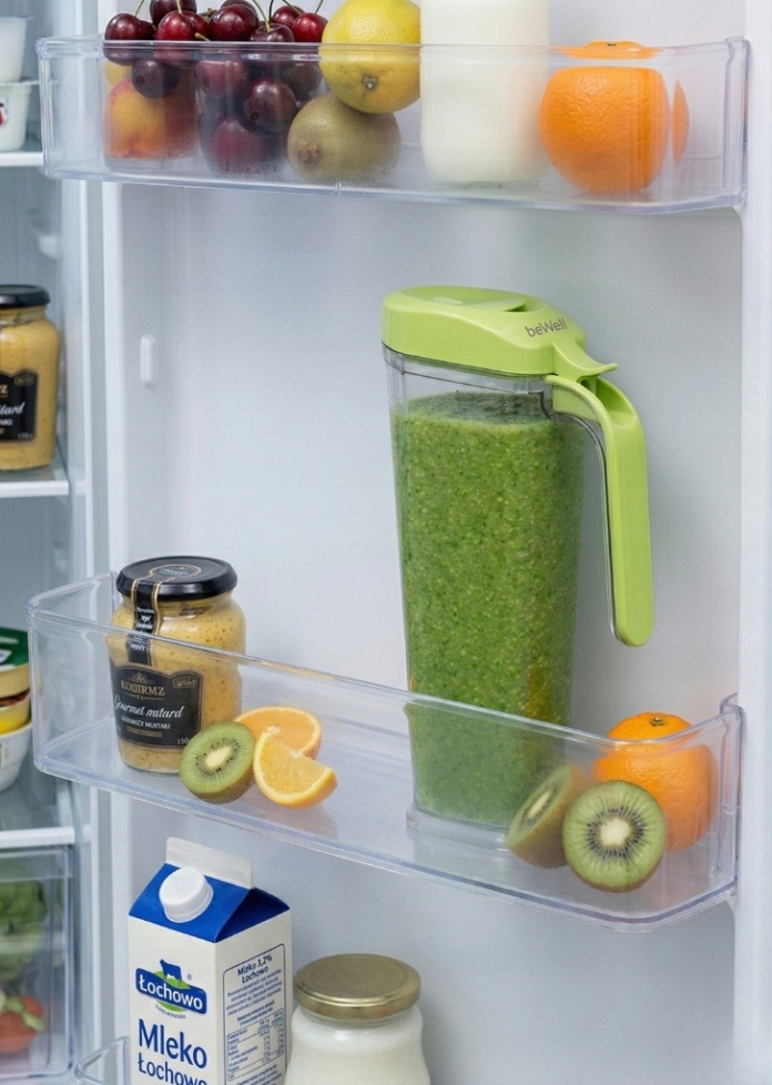 - Kompaktowy kształt – dzbanek bez problemu mieści się na półce w drzwiach lodówki (w zależności od modelu lodówki).